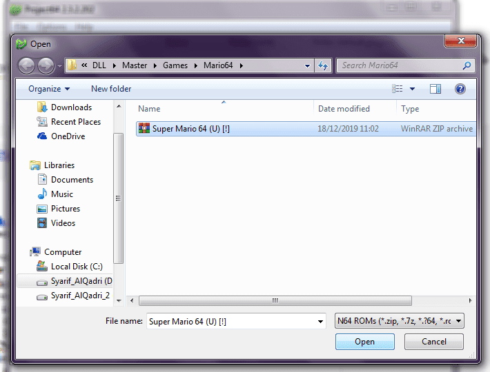 7. Jika sudah, cari file Super Mario 64 yang sudah anda download tadi. Biarkan saja format zip karena langsung terbaca. Jika sudah didapat silahkan anda klik Open.